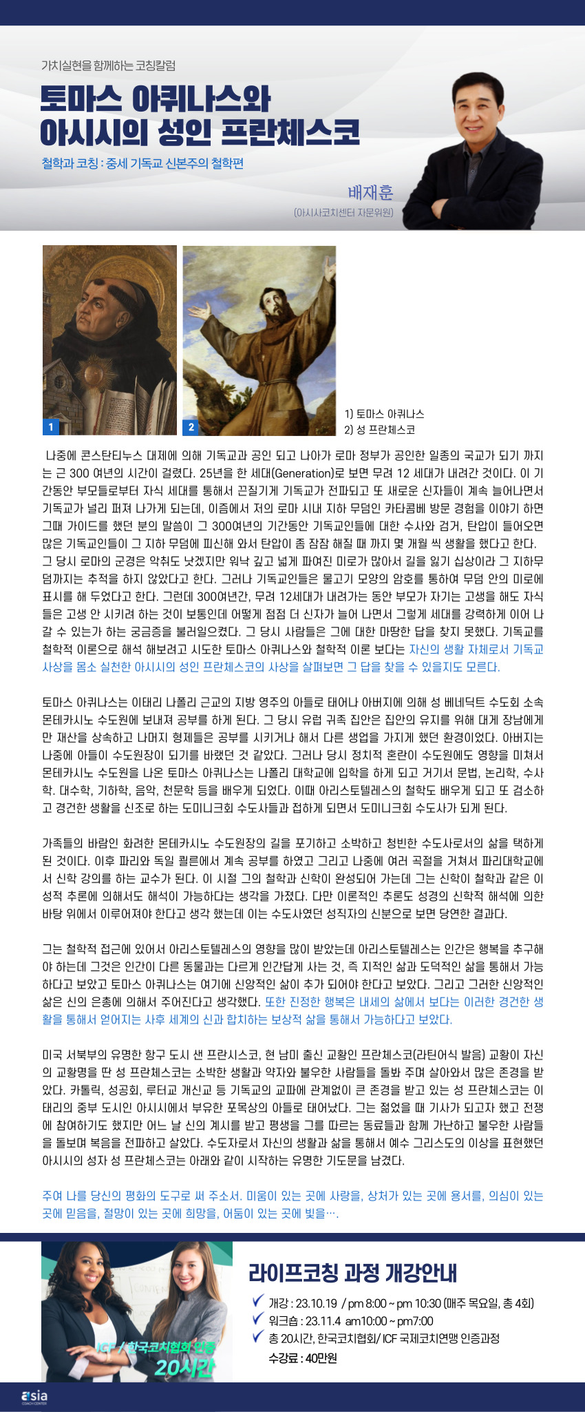 배재훈 코치님이 작성해주신 코칭 칼럼 - 토마스 아퀴나스와 아시시의 성인 프란체스코 를 소개드립니다.