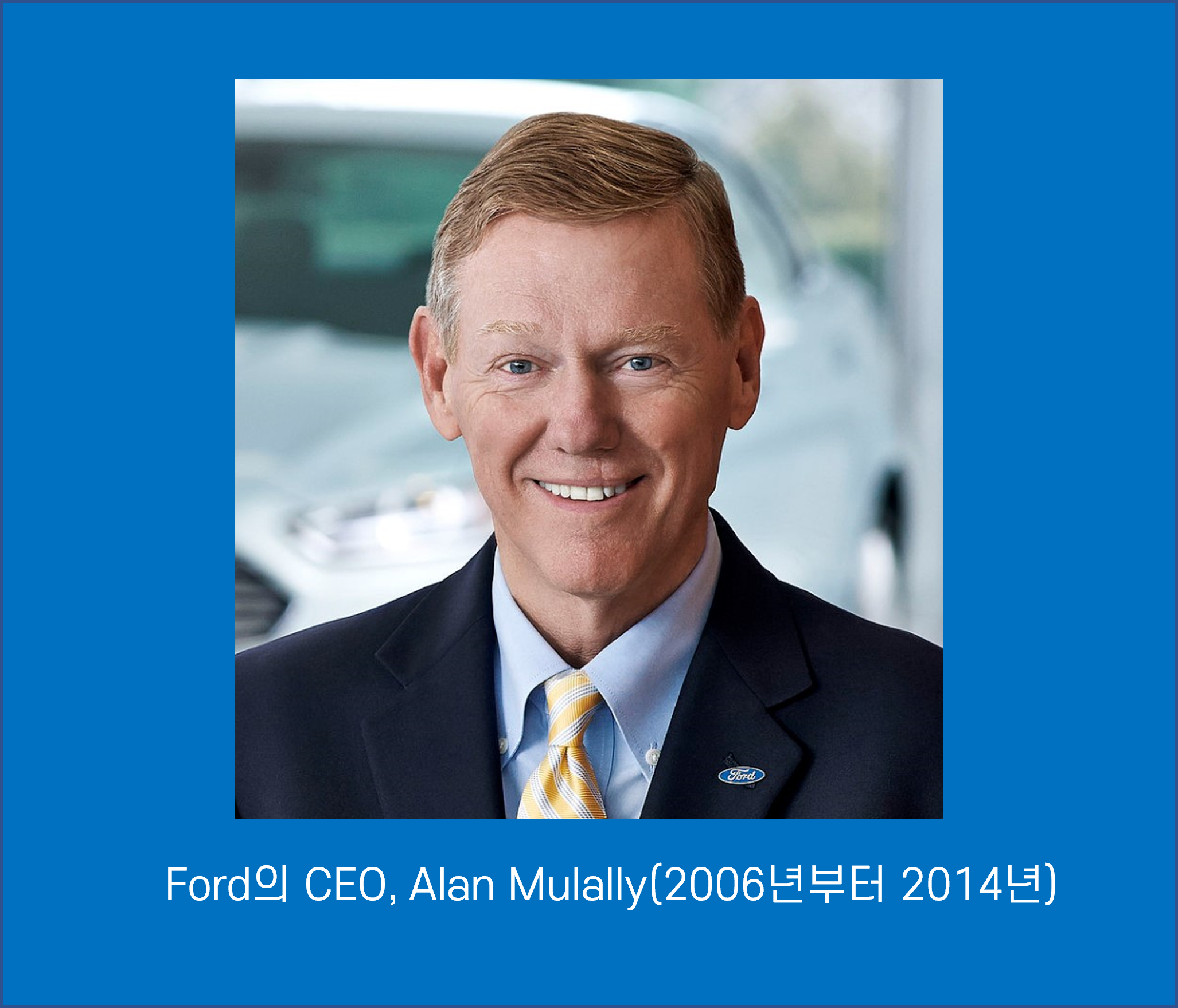 이때 Boeing에서 상업용 항공기 부문을 이끌며 성공적인 경력을 쌓은 숙련된 임원이었던 Alan Mulally가 2006년에 포드의 위기를 해결하기 위해 사장 겸 CEO로 임명되었습니다. 그는 Ford에 입사하면서 위기에 처한 회사를 과감하게 혁신하기 시작했습니다.